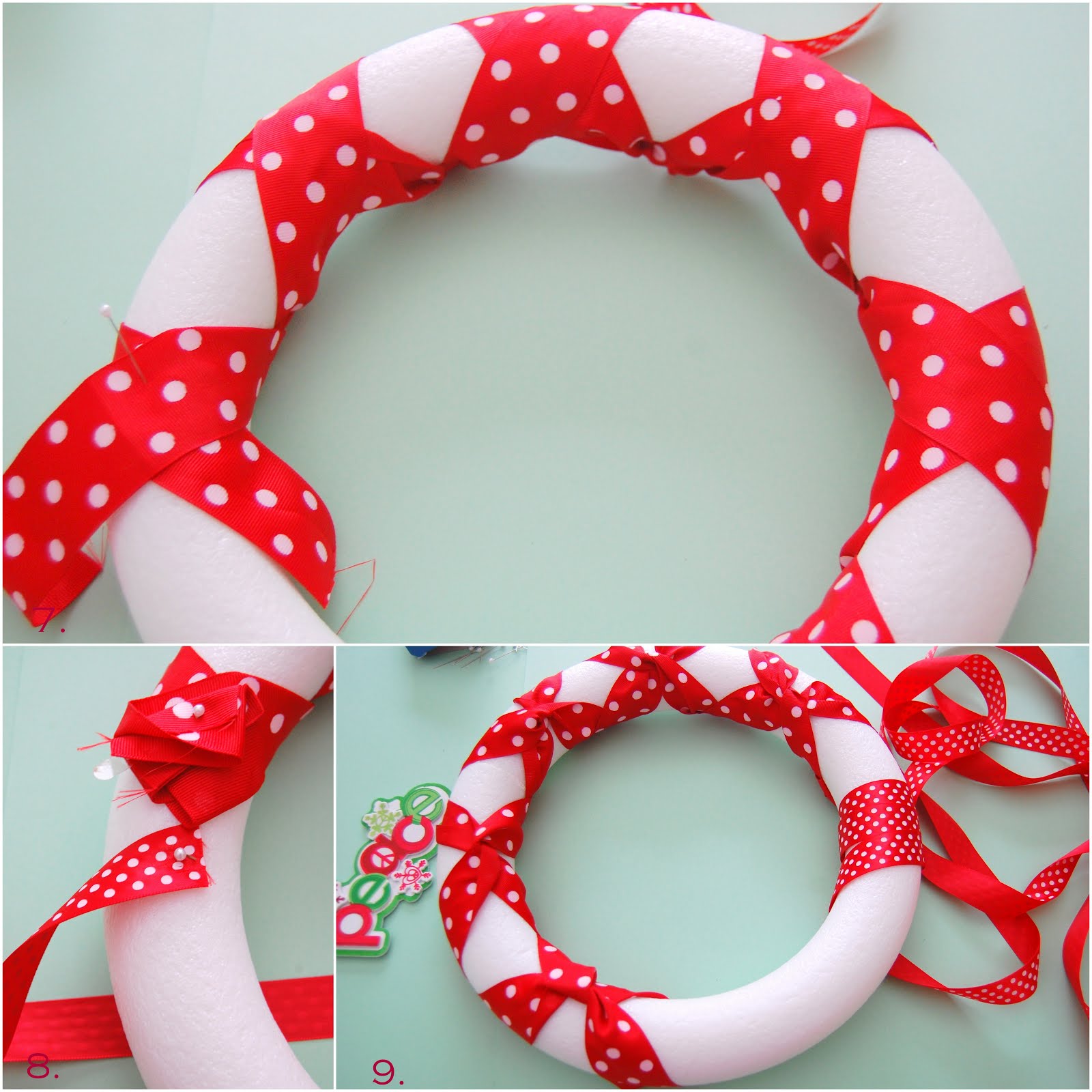 10. Pin the next ribbon end onto the back of the form.Keep wrapping till you finish the wreath.Secure the end with a pin again making sure all pins are at the back.